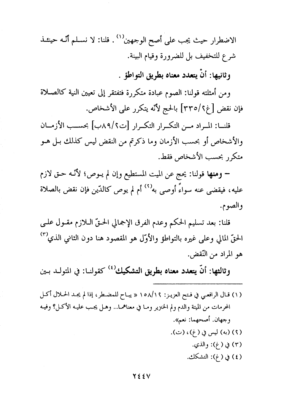 قلنا: بعد تسليم الحكم وعدم الفرق الإجمالي الحقّ اللازم مقول على الحقّ المالي وعلى غيره بالتواطؤ والأوّل هو المقصود هنا دون الثاني الذي (¬٣) هو المراد من النّقض.