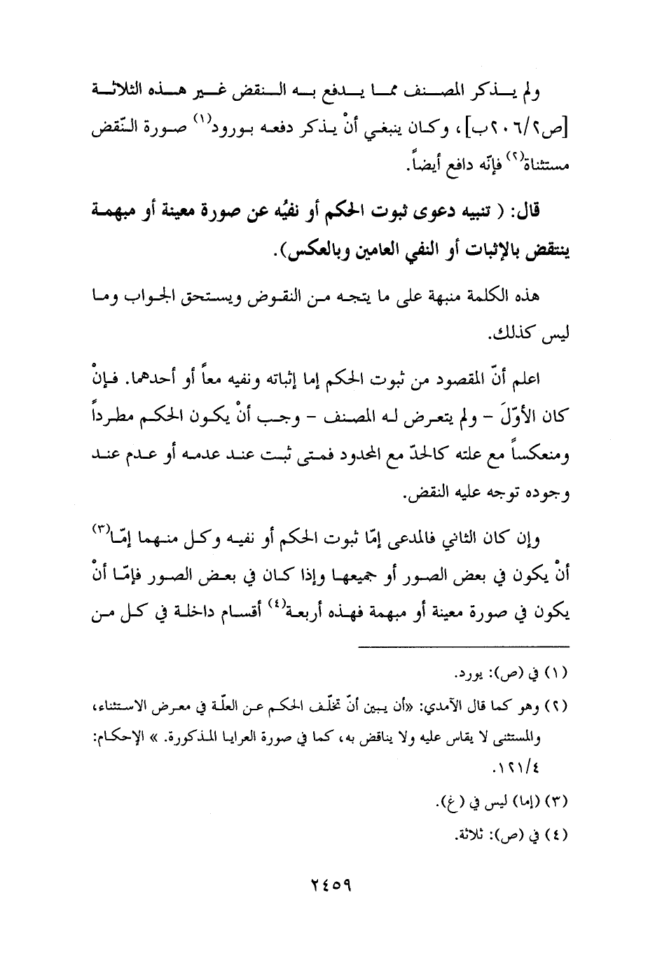 وإن كان الثاني فالمدعى إمّا ثبوت الحكم أو نفيه وكل منهما إمّا (¬٣) أنْ يكون في بعض الصور أو جميعها وإذا كان في بعض الصور فإمّا أنْ يكون في صورة معينة أو مبهمة فهذه أربعة (¬٤) أقسام داخلة في كل من