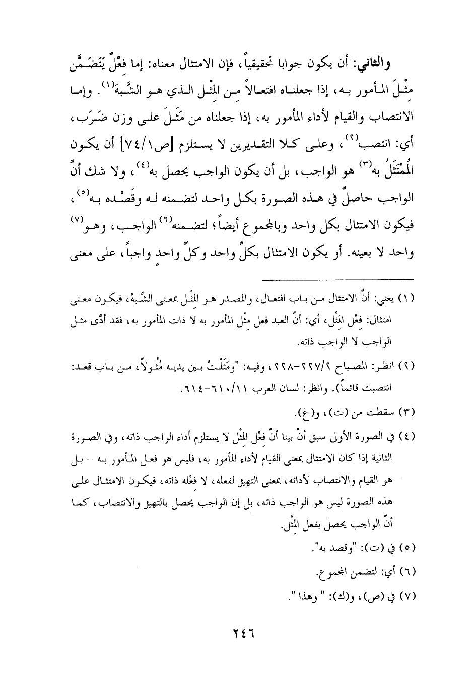 (¬١) يعني: أنَّ الامتثال من باب افتعال، والمصدر هو المِثْل بمعنى الشِّبهْ، فيكون معنى امتثال: فِعْل المِثْل، أي: أنَّ العبد فعل مِثْل المأمور به لا ذات المأمور به، فقد أدَّى مثل الواجب لا الواجب ذاته.