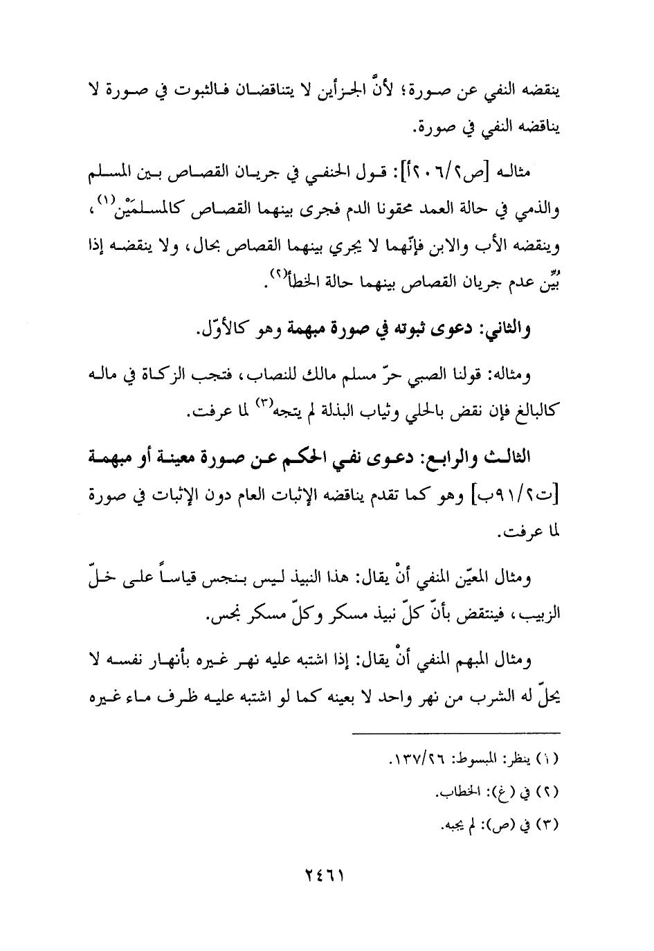 الثالث والرابع: دعوى نفي الحكم عن صورة معينة أو مبهمة وهو كما تقدم يناقضه الإثبات العام دون الإثبات في صورة لما عرفت.