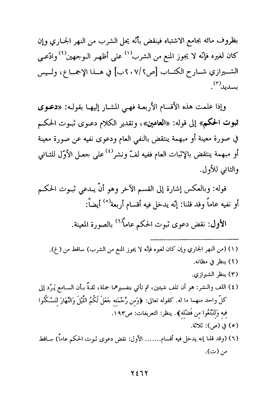 (¬٦) (وقد قلنا إنه يدخل فيه أقسام. . . . . . . الأول: نقض دعوى ثبوت الحكم عامًا) ساقط من (ت).