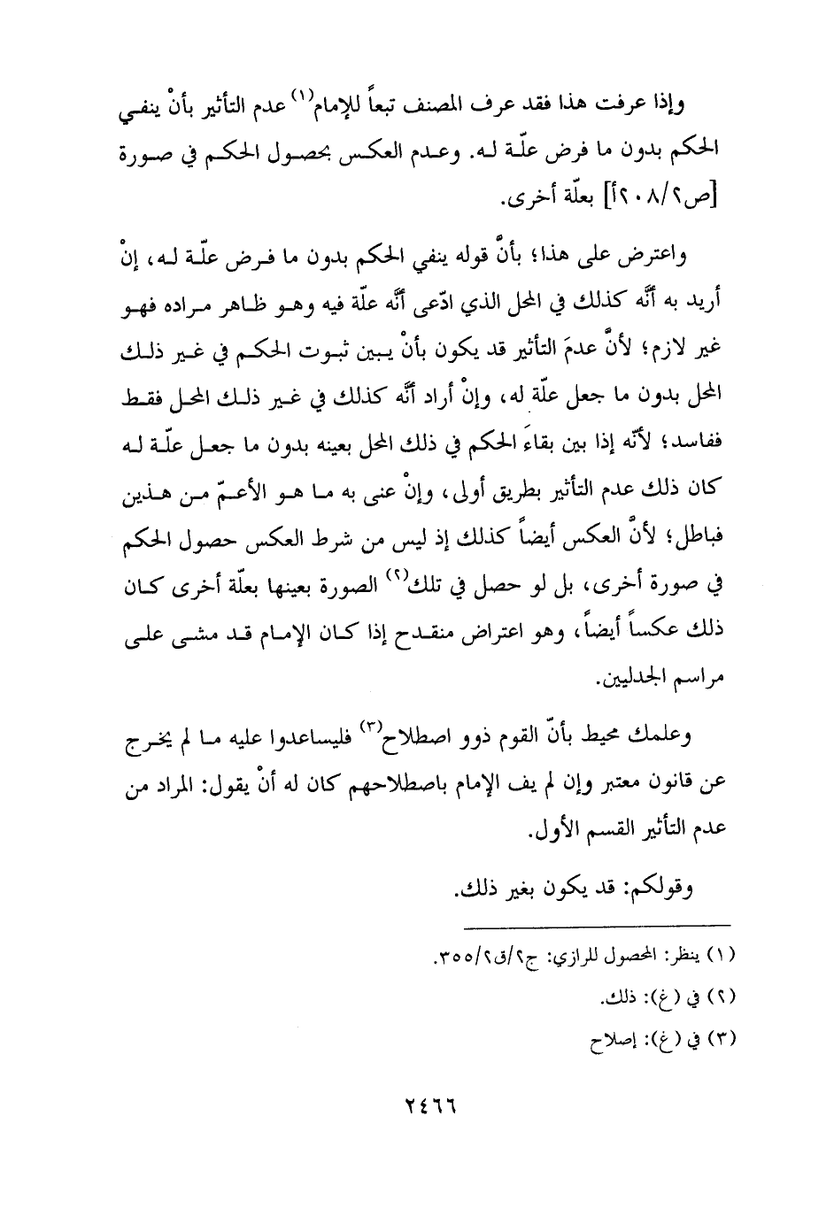 وعلمك محيط بأنّ القوم ذوو اصطلاح (¬٣) فليساعدوا عليه ما لم يخرج عن قانون معتبر وإن لم يف الإمام باصطلاحهم كان له أنْ يقول: المراد من عدم التأثير القسم الأول.
