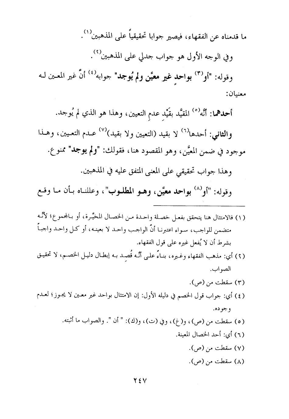 والثاني: أحدها (¬٦) لا بقيد (التعيين ولا بقيد) (¬٧) عدم التعيين، وهذا موجود في ضمن المعيَّن، وهو المقصود هنا، فقولك: "ولم يوجد" ممنوع.