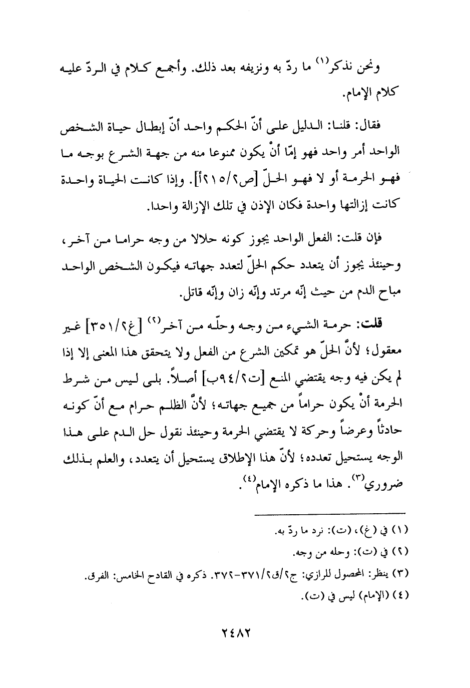 قلت: حرمة الشيء من وجه وحلّه من آخر (¬٢) غير معقول؛ لأنَّ الحلّ هو تمكين الشرع من الفعل ولا يتحقق هذا المعنى إلا إذا لم يكن فيه وجه يقتضي المنع أصلًا. بلى ليس من شرط الحرمة أنْ يكون حرامًا من جميع جهاته؛ لأنَّ الظلم حرام مع أنّ كونه حادثًا وعرضًا وحركة لا يقتضى الحرمة وحينئذ نقول حل الدم على هذا الوجه يستحيل تعدده؛ لأنّ هذا الإطلاق يستحيل أن يتعدد، والعلم بذلك ضروري (¬٣). هذا ما ذكره الإمام (¬٤).
