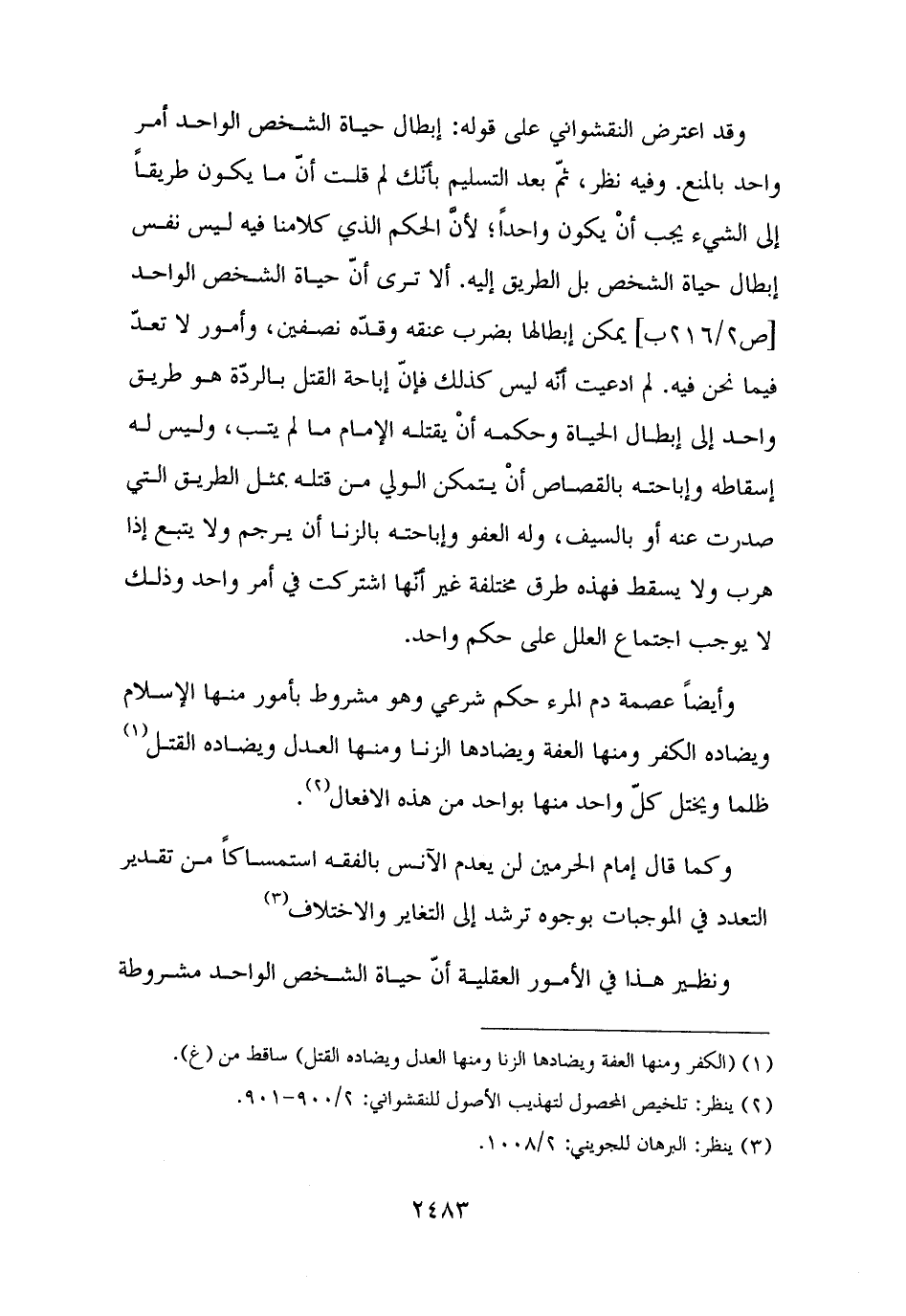 وقد اعترض النقشواني على قوله: إبطال حياة الشخص الواحد أمر واحد بالمنع. وفيه نظر، ثمّ بعد التسليم بأنّك لم قلت أنّ ما يكون طريقًا إلى الشيء يجب أنْ يكون واحدًا؛ لأنَّ الحكم الذي كلامنا فيه ليس نفس إبطال حياة الشخص بل الطريق إليه. ألا ترى أنّ حياة الشخص الواحد يمكن إبطالها بضرب عنقه وقدّه نصفين، وأمور لا تعدّ فيما نحن فيه. لم ادعيت أنّه ليس كذلك فإنّ إباحة القتل بالردّة هو طريق واحد إلى إبطال الحياة وحكمه أنْ يقتله الإمام ما لم يتب، وليس له إسقاطه وإباحته بالقصاص أنْ يتمكن الولي من قتله بمثل الطريق التي صدرت عنه أو بالسيف، وله العفو وإباحته بالزنا أن يرجم ولا يتبع إذا هرب ولا يسقط فهذه طرق مختلفة غير أنّها اشتركت في أمر واحد وذلك لا يوجب اجتماع العلل على حكم واحد.