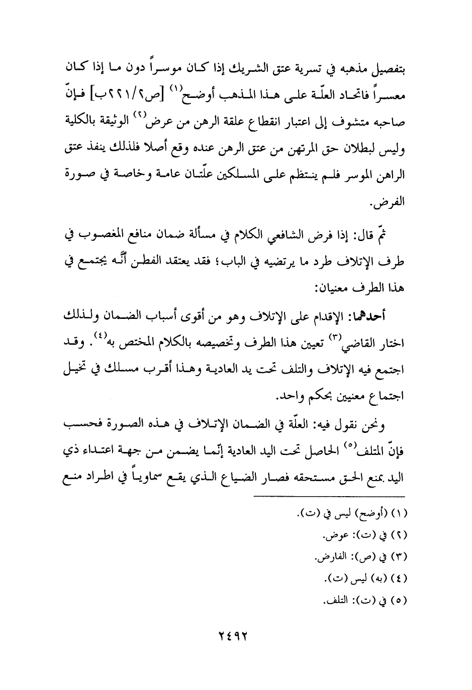 أحدهما: الإقدام على الإتلاف وهو من أقوى أسباب الضمان ولذلك اختار القاضي (¬٣) تعيين هذا الطرف وتخصيصه بالكلام المختص به (¬٤). وقد اجتمع فيه الإتلاف والتلف تحت يد العادية وهذا أقرب مسلك في تخيل اجتماع معنيين بحكم واحد.