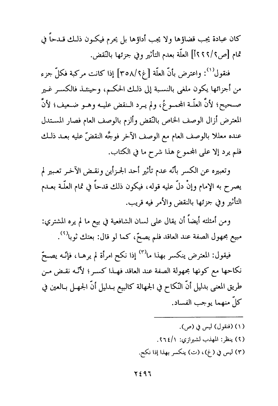 وتعبيره عن الكسر بأنّه عدم تأثير أحد الجزأين ونقض الآخر تعبير لم يصرح به الإمام وإنْ دلّ عليه قوله، فيكون ذلك قدحًا في تمام العلّة بعدم التأثير وفي جزئها بالنقض والأمر فيه قريب.