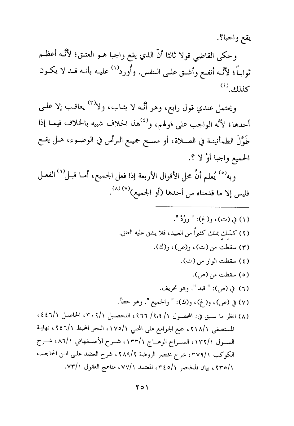 وحكى القاضي قولا ثالثا أنّ الذي يقع واجبا هو العتق؛ لأنَّه أعظم ثوابًا؛ لأنَّه أنفع وأشق على النفس. وأُورد (¬١) عليه بأنه قد لا يكون كذلك. (¬٢)
