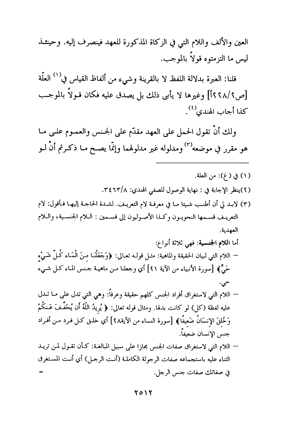ولك أنْ تقول الحمل على العهد مقدّم على الجنس والعموم على ما هو مقرر في موضعه (¬٣) ومدلوله غير مدلولهما وإنّما يصح ما ذكرتم أنْ لو