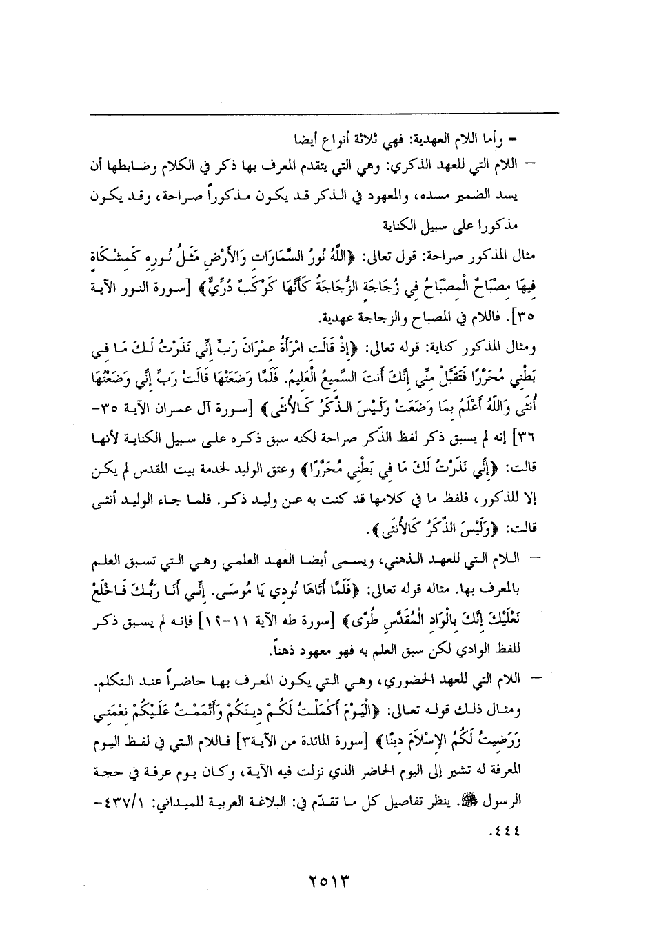 - اللام التي للعهد الحضوري، وهى التي يكون المعرف بها حاضرًا عند التكلم. ومثال ذلك قوله تعالى: {الْيَوْمَ أَكْمَلْتُ لَكُمْ دِينَكُمْ وَأَتْمَمْتُ عَلَيْكُمْ نِعْمَتِي وَرَضِيتُ لَكُمُ الْإِسْلَامَ دِينًا} [سورة المائدة من الآية ٣] فاللام التي في لفظ اليوم المعرفة له تشير إلى اليوم الحاضر الذي نزلت فيه الآية، وكان يوم عرفة في حجة الرسول - صلى الله عليه وسلم -. ينظر تفاصيل كل ما تقدّم في: البلاغة العربية للميداني: ١/ ٤٣٧ - ٤٤٤.