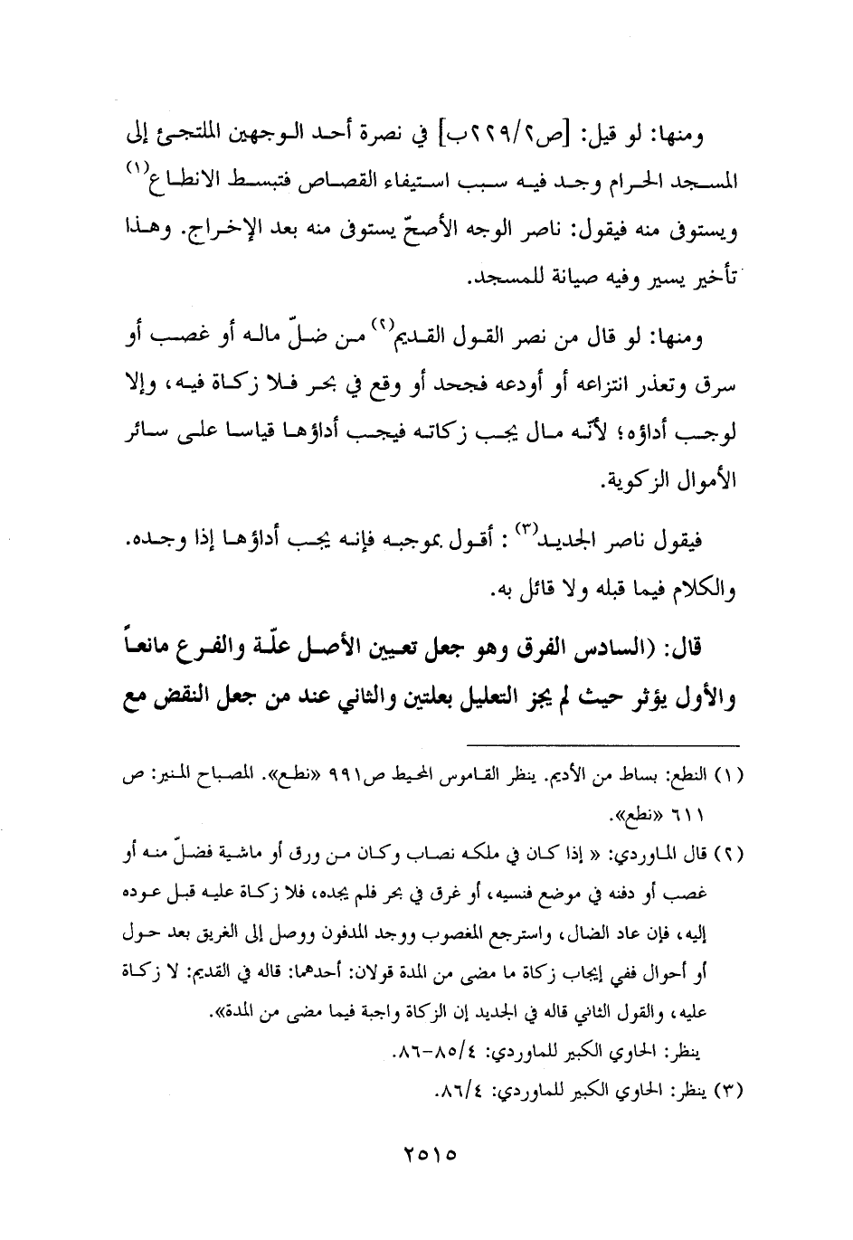 (¬٢) قال الماوردي: "إذا كان في ملكه نصاب وكان من ورق أو ماشية فضلّ منه أو غصب أو دفنه في موضع فنسيه، أو غرق في بحر فلم يجده، فلا زكاة عليه قبل عوده إليه، فإن عاد الضال، واسترجع المغصوب ووجد المدفون ووصل إلى الغريق بعد حول أو أحوال ففي إيجاب زكاة ما مضى من المدة قولان: أحدهما: قاله في القديم: لا زكاة عليه، والقول الثاني قاله في الجديد إن الزكاة واجبة فيما مضى من المدة".