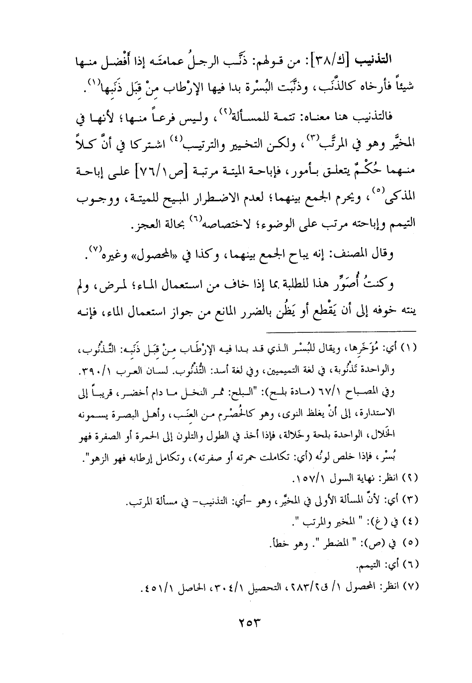 فالتذنيب هنا معناه: تتمة للمسألة (¬٢)، وليس فرعًا منها؛ لأنها في المخيَّر وهو في المرتَّب (¬٣)، ولكن التخيير والترتيب (¬٤) اشتركا في أنَّ كلًا منهما حُكْمٌ يتعلق بأمور، فإباحة الميتة مرتبة على إباحة المذكى (¬٥)، ويحرم الجمع بينهما؛ لعدم الاضطرار المبيح للميتة، ووجوب التيمم وإباحته مرتب على الوضوء؛ لاختصاصه (¬٦) بحالة العجز.
