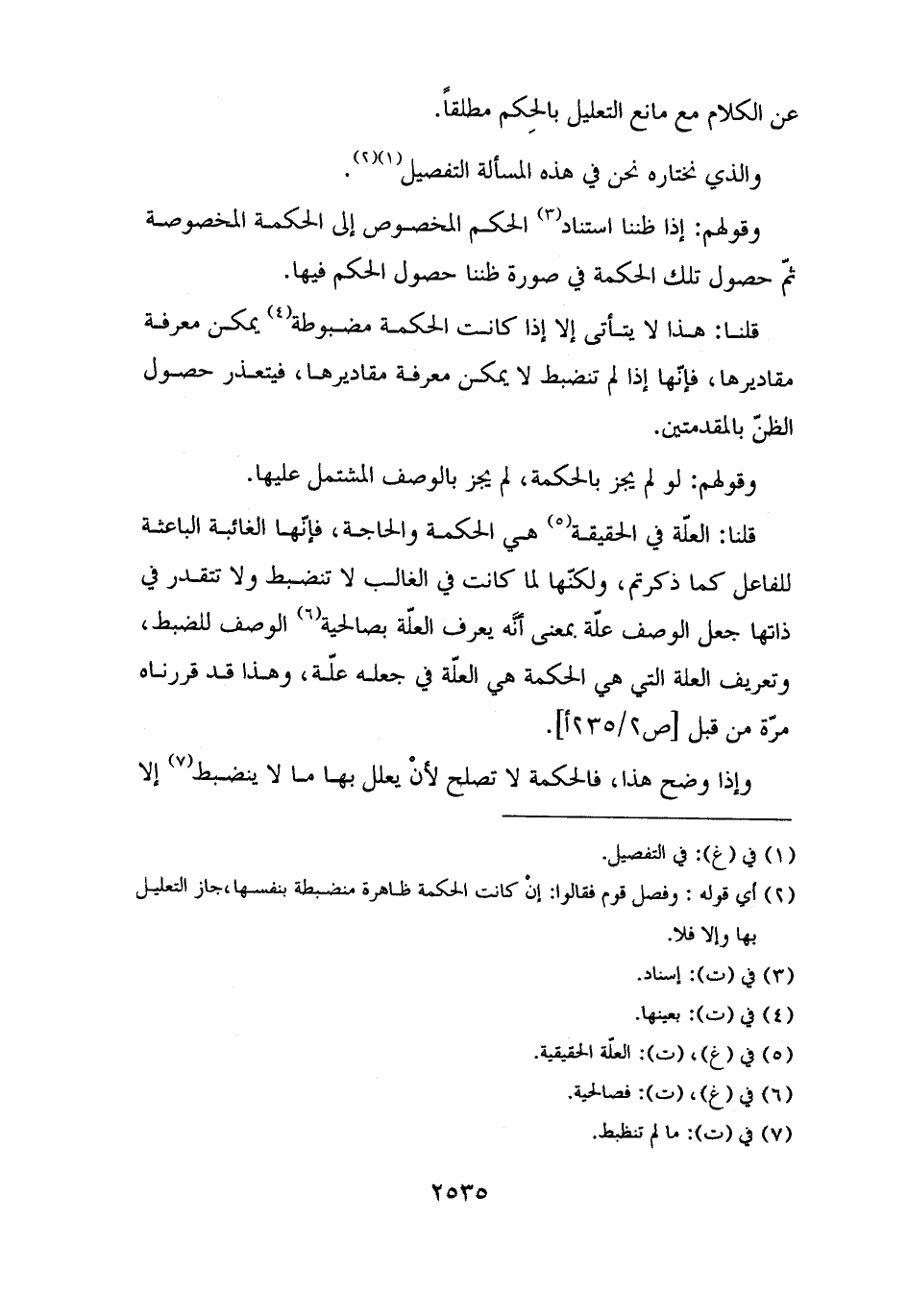 (¬٢) أي قوله: وفصل قوم فقالوا: إنْ كانت الحكمة ظاهرة منضبطة بنفسها، جاز التعليل بها وإلا فلا.