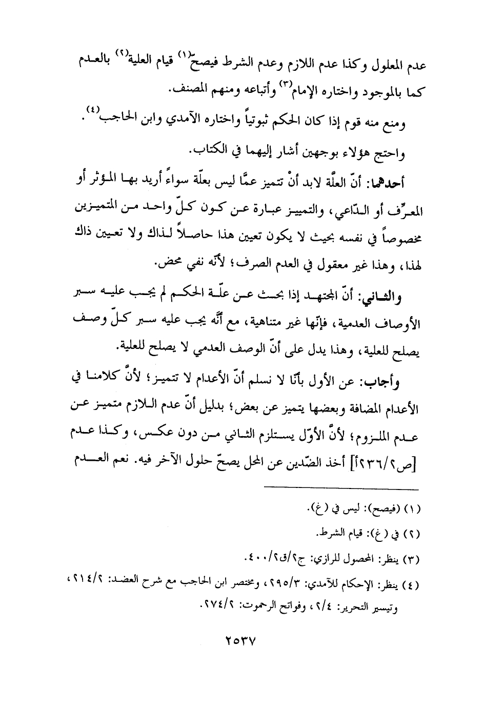 (¬٤) ينظر: الإحكام للآمدي: ٣/ ٢٩٥، ومختصر ابن الحاجب مع شرح العضد: ٢/ ٢١٤، وتيسير التحرير: ٤/ ٢، وفواتح الرحموت: ٢/ ٢٧٤.