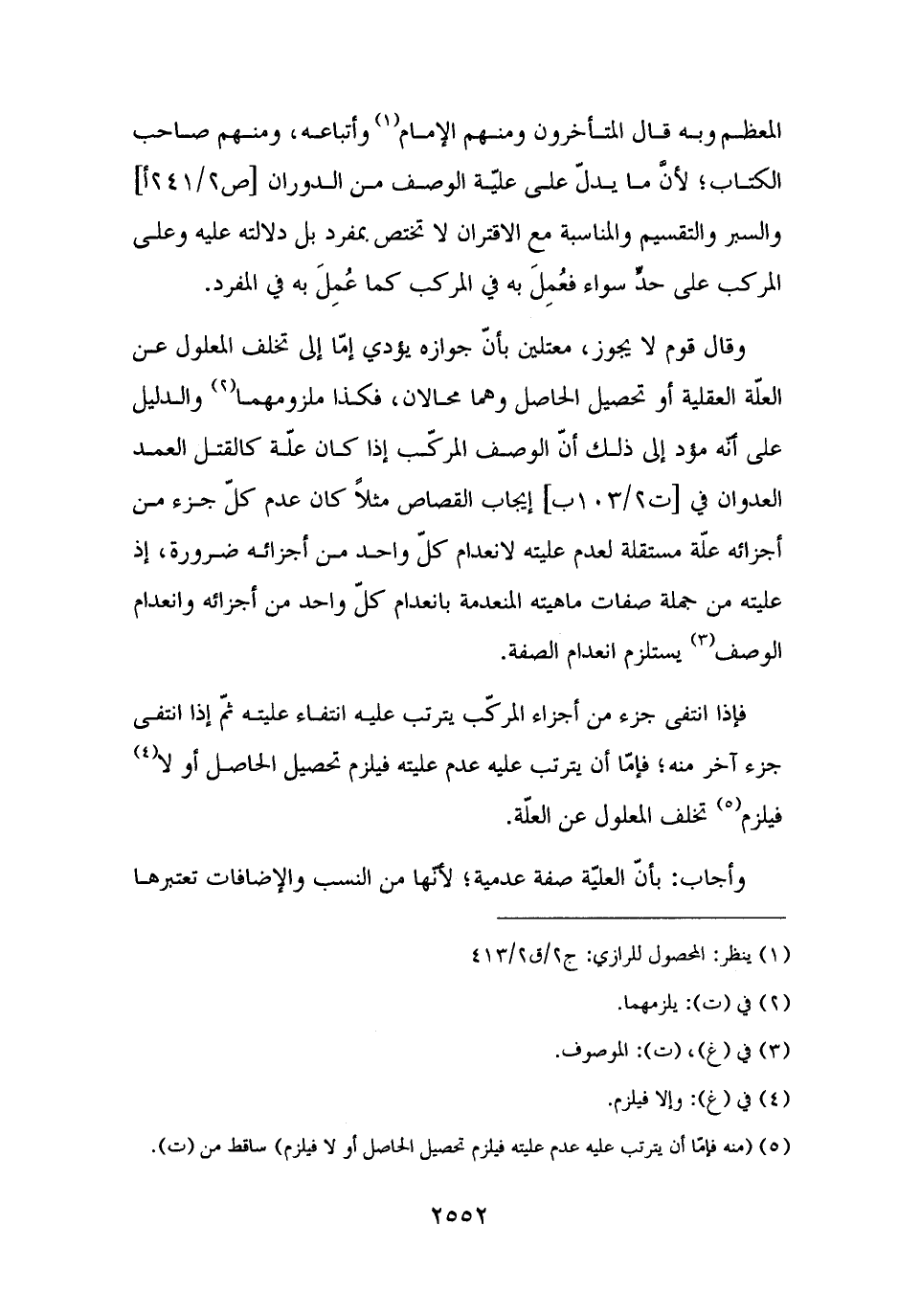 وقال قوم لا يجوز، معتلين بأنّ جوازه يؤدي إمّا إلى تخلف المعلول عن العلّة العقلية أو تحصيل الحاصل وهما محالان، فكذا ملزومهما (¬٢) والدليل على أنّه مؤد إلى ذلك أنّ الوصف المركّب إذا كان علّة كالقتل العمد العدوان في إيجاب القصاص مثلًا كان عدم كلّ جزء من أجزائه علّة مستقلة لعدم عليته لانعدام كلّ واحد من أجزائه ضرورة، إذ عليته من جملة صفات ماهيته المنعدمة بانعدام كلّ واحد من أجزائه وانعدام الوصف (¬٣) يستلزم انعدام الصفة.