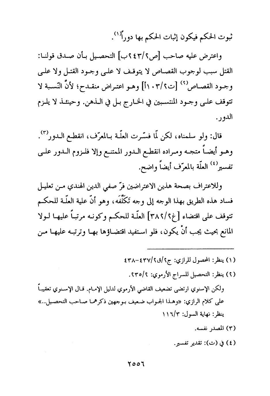 قال: ولو سلمناه، لكن لمّا فسّرت العلّة بالمعرّف، انقطع الدور (¬٣). وهو أيضًا متجه ومراده انقطع الدور الممتنع وإلا فلزوم الدور على تفسير (¬٤) العلّة بالمعرّف أيضًا واضح.