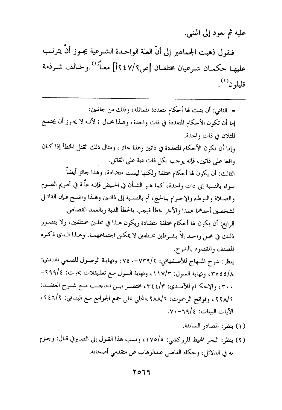 فنقول ذهبت الجماهير إلى أنّ العلة الواحدة الشرعية يجوز أنْ يترتب عليها حكمان شرعيان مختلفان معًا (¬١). وخالف شرذمة قليلون (¬٢).