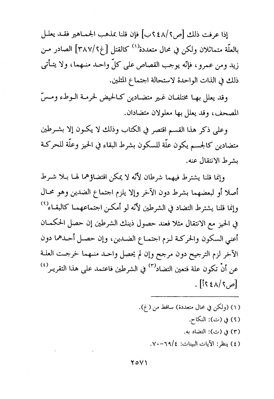 وإنما قلنا يشترط فيهما شرطان لأنّه لا يمكن اقتضاؤهما لها بلا شرط أصلا أو لبعضهما بشرط دون الآخر وإلا يلزم اجتماع الضدين وهو محال وإنما قلنا يشترط التضاد في الشرطين لأنّه لو أمكن اجتماعهما كالبقاء (¬٢) في الحيز مع الانتقال مثلا فعند حصول ذينك الشرطين إن حصل الحكمان أعني السكون والحركة لزم اجتماع الضدين، وإن حصل أحدهما دون الآخر لزم الترجيح دون مرجح وإن لم يحصل واحد منهما خرجت العلة عن أنْ تكون علة فتعين التضاد (¬٣) في الشرطين فاعتمد على هذا التقرير (¬٤).