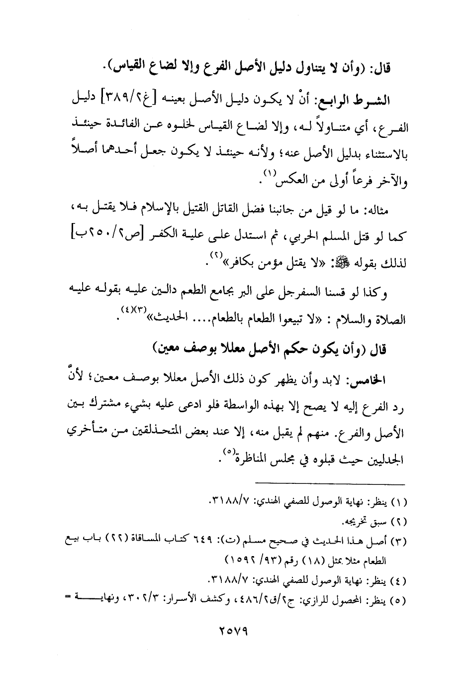 الخامس: لا بد وأن يظهر كون ذلك الأصل معللا بوصف معين؛ لأنَّ رد الفرع إليه لا يصح إلا بهذه الواسطة فلو ادعى عليه بشيء مشترك بين الأصل والفرع. منهم لم يقبل منه، إلا عند بعض المتحذلقين من متأخري الجدليين حيث قبلوه في مجلس المناظرة (¬٥).