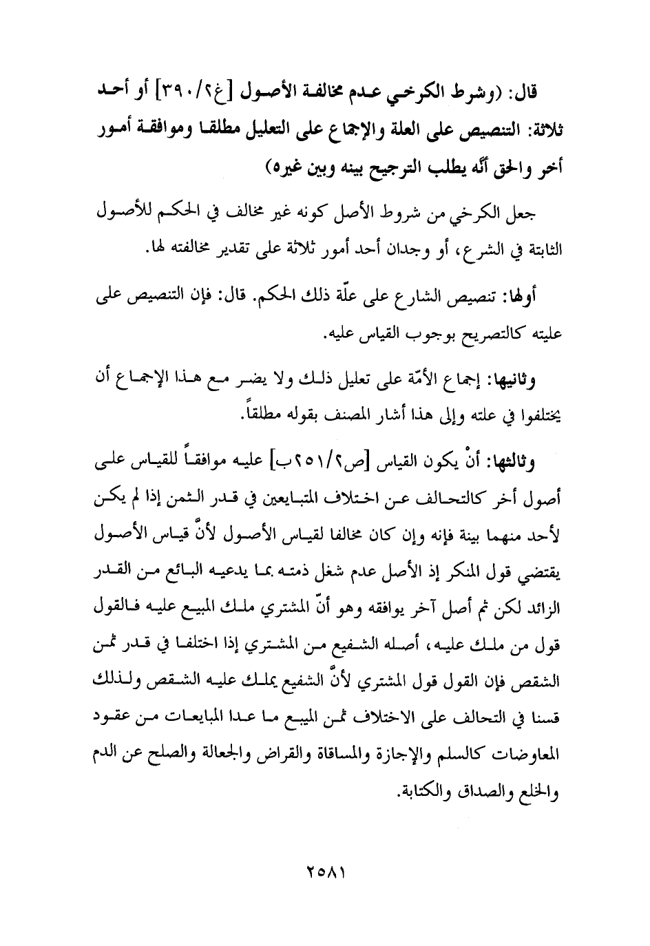 قال: (وشرط الكرخي عدم مخالفة الأصول أو أحد ثلاثة: التنصيص على العلة والإجماع على التعليل مطلقا وموافقة أمور أخر والحق أنَّه يطلب الترجيح بينه وبين غيره)