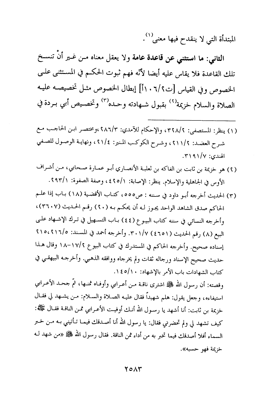 الثاني: ما استثني عن قاعدة عامة ولا يعقل معناه من غير أنْ تنسخ تلك القاعدة فلا يقاس عليه أيضًا لأنّه فهم ثبوت الحكم في المستثنى على الخصوص وفي القياس إبطال الخصوص مثل تخصيصه عليه الصلاة والسلام خزيمة (¬٢) بقبول شهادته وحده (¬٣) وتخصيص أبي بردة في