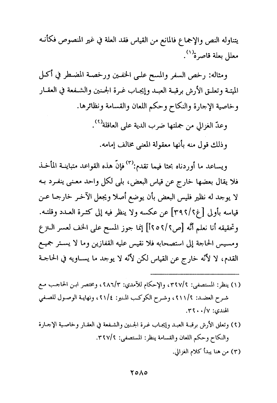 ويساعد ما أوردناه بحثا فيما تقدم: (¬٣) فإنّ هذه القواعد متباينة المأخذ فلا يقال بعضها خارج عن قياس البعض، بلى لكل واحد معنى ينفرد به لا يوجد له نظير فليس البعض بأن يوضع أصلا ويجعل الآخر خارجا عن قياسه بأولى عن عكسه ولا ينظر فيه إلى كثرة العدد وقلته. وتحقيقه أنا نعلم أنَّه إنما جوز المسح على الخف لعسر النزع ومسيس الحاجة إلى استصحابه فلا نقيس عليه القفازين وما لا يستر جميع القدم، لا لأنَّه خارج عن القياس لكن لأنَّه لا يوجد ما يساويه في الحاجة