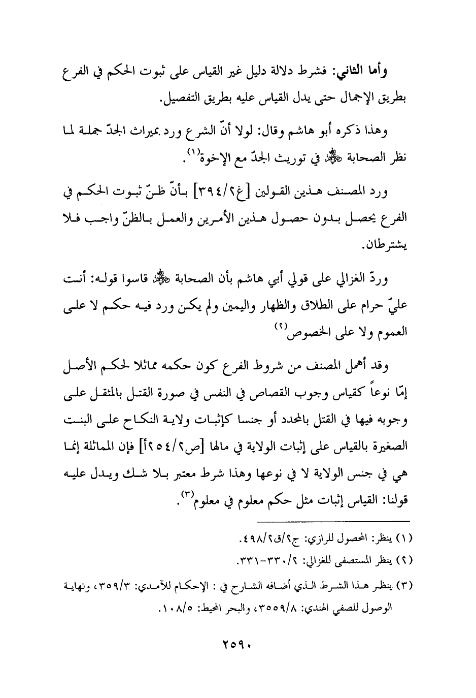 وأما الثاني: فشرط دلالة دليل غير القياس على ثبوت الحكم في الفرع بطريق الإجمال حتى يدل القياس عليه بطريق التفصيل.
