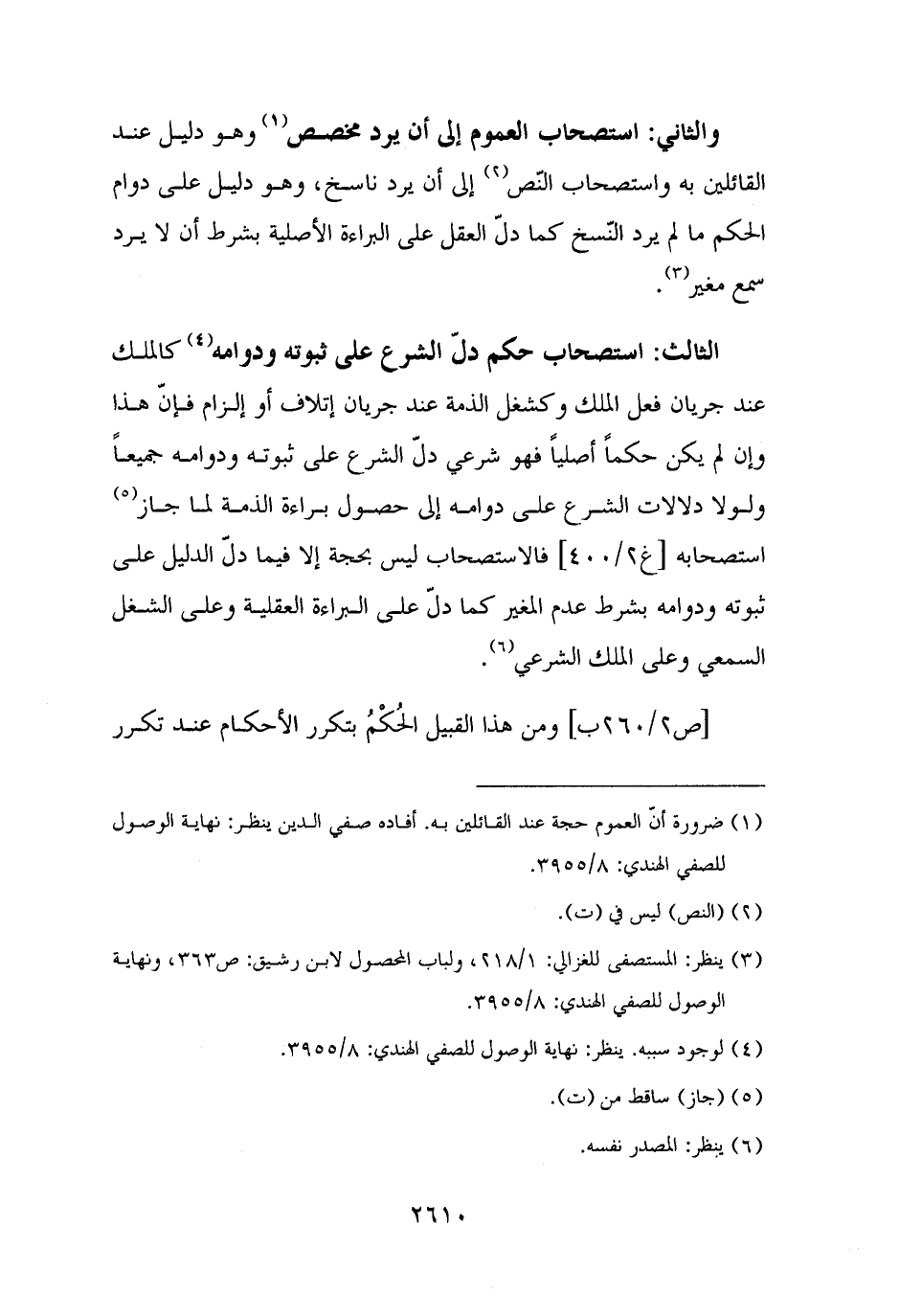 والثاني: استصحاب العموم إلى أن يرد مخصص (¬١) وهو دليل عند القائلين به واستصحاب النّص (¬٢) إلى أن يرد ناسخ، وهو دليل على دوام الحكم ما لم يرد النّسخ كما دلّ العقل على البراءة الأصلية بشرط أن لا يرد سمع مغير (¬٣).