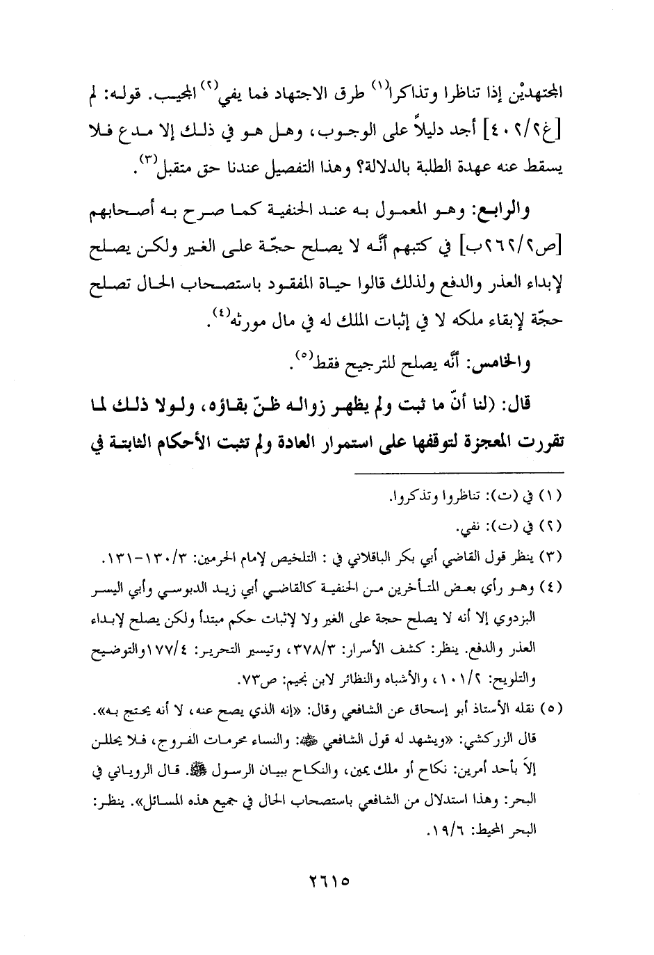 (¬٤) وهو رأي بعض المتأخرين من الحنفية كالقاضي أبي زيد الدبوسي وأبي اليسر البزدوي إلا أنه لا يصلح حجة على الغير ولا لإثبات حكم مبتدأ ولكن يصلح لإبداء العذر والدفع. ينظر: كشف الأسرار: ٣/ ٣٧٨، وتيسير التحرير: ٤/ ١٧٧ والتوضيح والتلويح: ٢/ ١٠١، والأشباه والنظائر لابن نجيم: ص ٧٣.