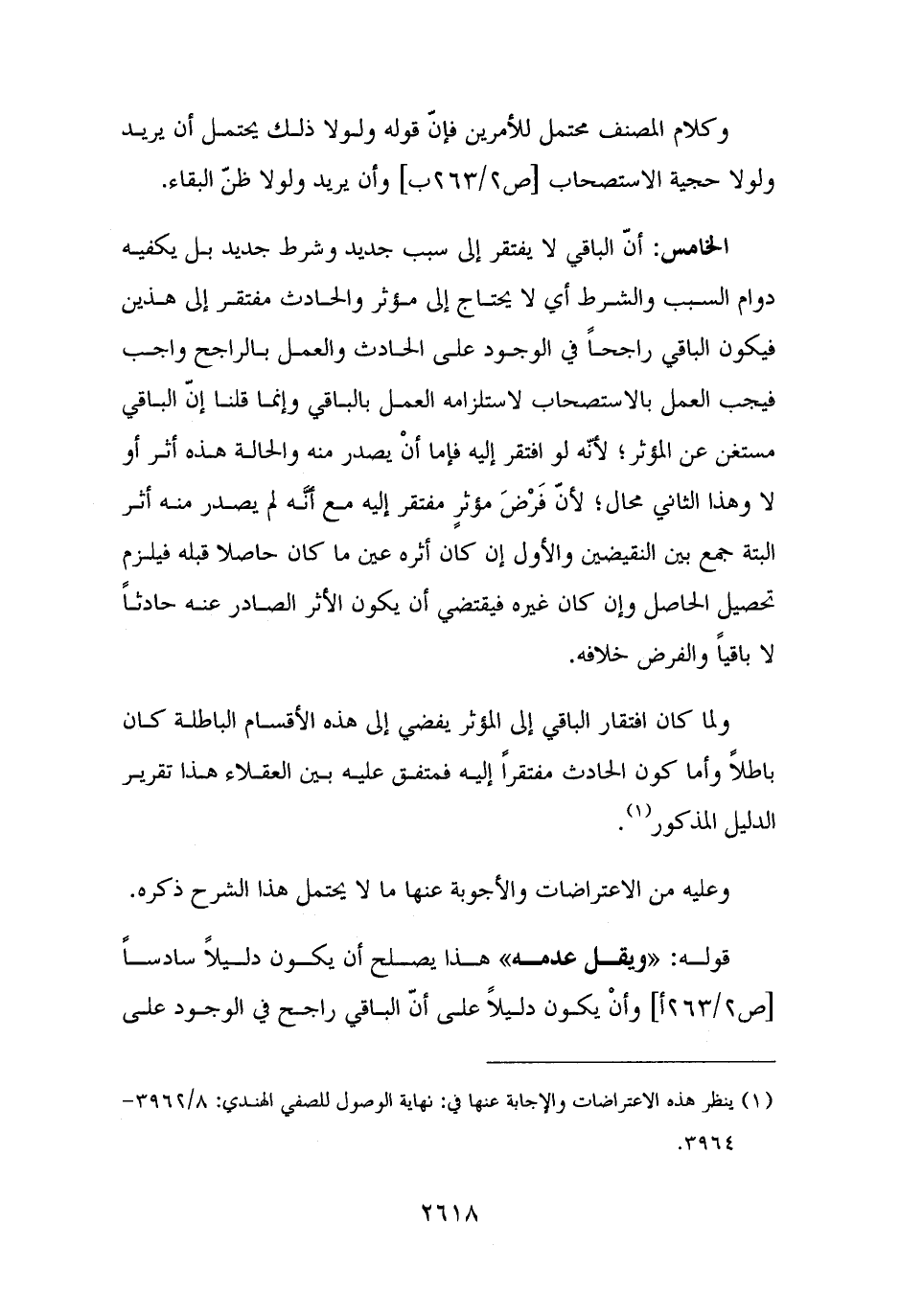 الخامس: أنّ الباقي لا يفتقر إلى سبب جديد وشرط جديد بل يكفيه دوام السبب والشرط أي لا يحتاج إلى مؤثر والحادث مفتقر إلى هذين فيكون الباقي راجحًا في الوجود على الحادث والعمل بالراجح واجب فيجب العمل بالاستصحاب لاستلزامه العمل بالباقي وإنما قلنا إنّ الباقي مستغن عن المؤثر؛ لأنّه لو افتقر إليه فإما أنْ يصدر منه والحالة هذه أثر أو لا وهذا الثاني محال؛ لأنّ فَرْضَ مؤثرٍ مفتقر إليه مع أنَّه لم يصدر منه أثر البتة جمع بين النقيضين والأول إن كان أثره عين ما كان حاصلا قبله فيلزم تحصيل الحاصل وإن كان غيره فيقتضي أن يكون الأثر الصادر عنه حادثًا لا باقيًا والفرض خلافه.