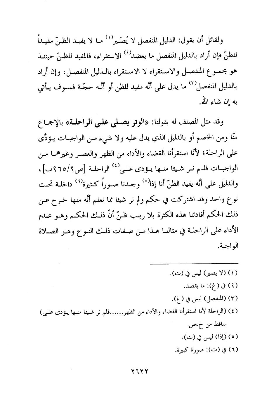 وقد مثل المصنف له بقولنا: "الوتر يصلى على الراحلة" بالإجماع منّا ومن الخصم أو بالدليل الذي يدل عليه ولا شيء من الواجبات يؤدَّى على الراحلة؛ لأنّا استقرأنا القضاء والأداء من الظهر والعصر وغيرهما من الواجبات فلم نر شيئا منها يؤدى على (¬٤) الراحلة، والدليل على أَنَّه يفيد الظنّ أنا إذا (¬٥) وجدنا صورًا كثيرة (¬٦) داخلة تحت نوع واحد وقد اشتركت في حكم ولم نر شيئا مما نعلم أنَّه منها خرج عن ذلك الحكم أفادتنا هذه الكثرة بلا ريب ظنّ أنّ ذلك الحكم وهو عدم الأداء على الراحلة في مثالنا هذا من صفات ذلك النوع وهو الصلاة الواجبة.