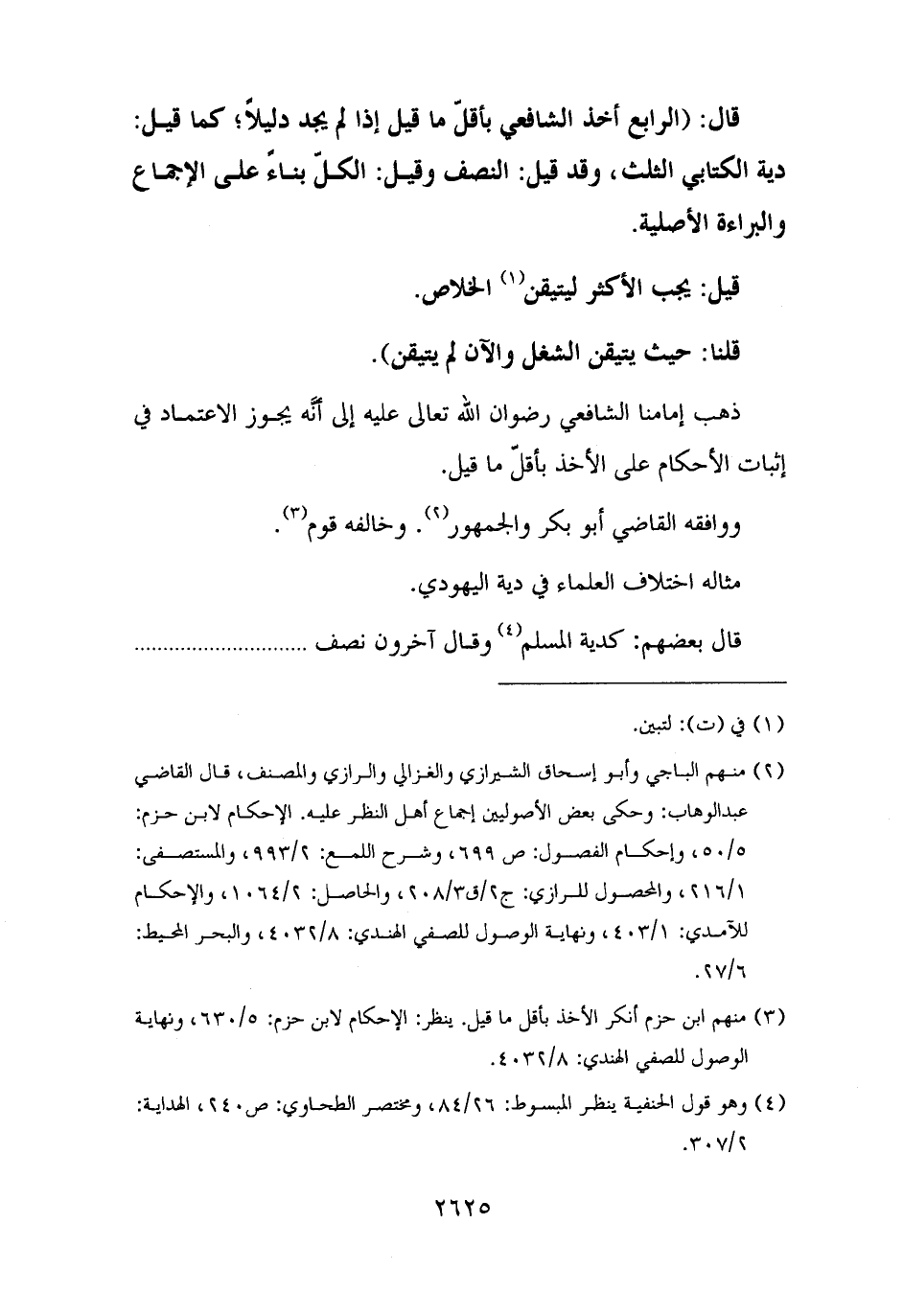 قال: (الرابع أخذ الشافعي بأقلّ ما قيل إذا لم يجد دليلًا؛ كما قيل: دية الكتابي الثلث، وقد قيل: النصف وقيل: الكلّ بناءً على الإجماع والبراءة الأصلية.