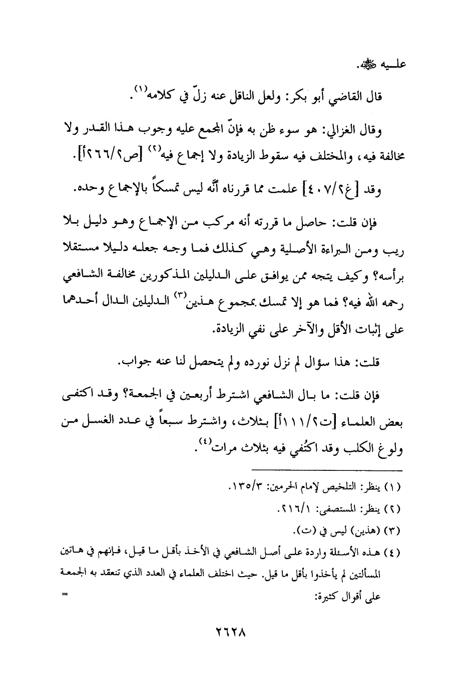 وقال الغزالي: هو سوء ظن به فإنّ المجمع عليه وجوب هذا القدر ولا مخالفة فيه، والمختلف فيه سقوط الزيادة ولا إجماع فيه (¬٢).