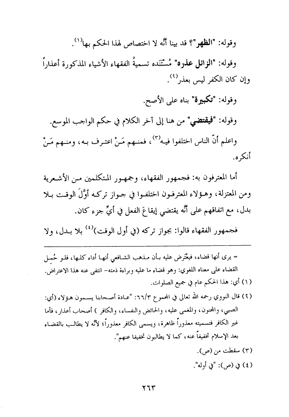(¬٢) قال النووي رحمه الله تعالى في المجموع ٣/ ٦٦: "عادة أصحابنا يسمون هؤلاء (أي: الصبي، والمجنون، والمغمى عليه، والحائض والنفساء، والكافر) أصحاب أعذار، فأما غير الكافر فتسميته معذورًا ظاهرة، ويسمى الكافر معذورًا؛ لأنَّه لا يطالب بالقضاء بعد الإسلام تخفيفًا عنه، كما لا يطالبون تخفيفًا عنهم".
