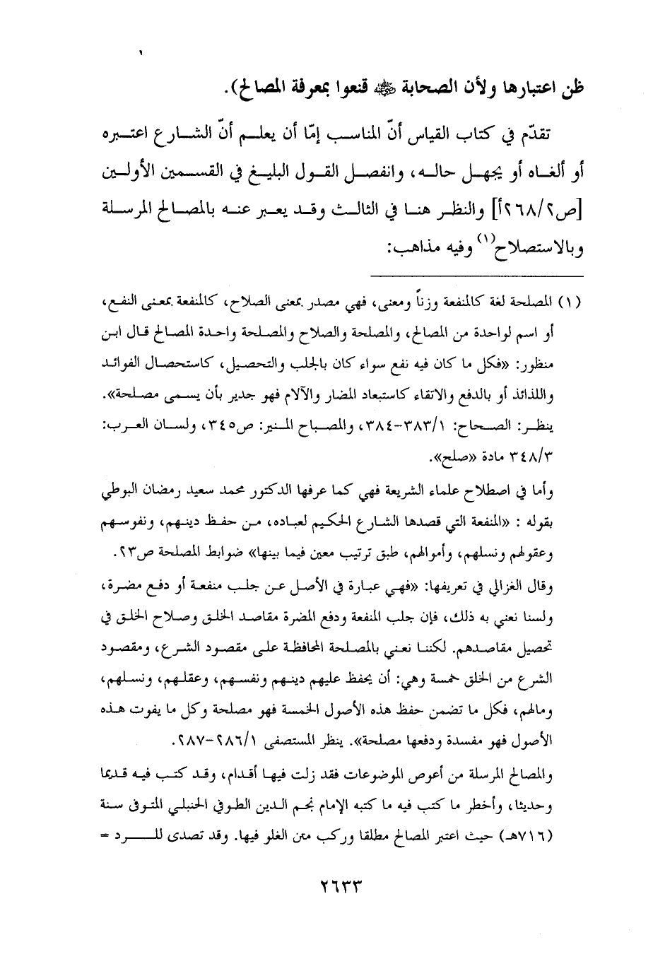 والمصالح المرسلة من أعوص الموضوعات فقد زلت فيها أقدام، وقد كتب فيه قديما وحديثا، وأخطر ما كتب فيه ما كتبه الإمام نجم الدين الطوفي الحنبلي المتوفى سنة (٧١٦ هـ) حيث اعتبر المصالح مطلقا وركب متن الغلو فيها. وقد تصدى للرد =