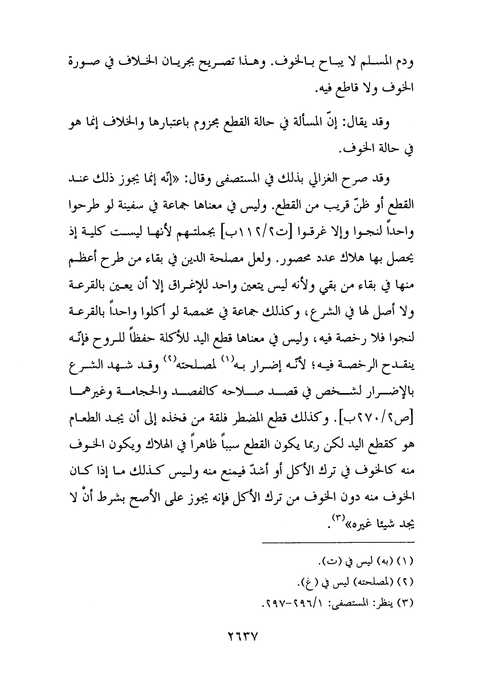وقد صرح الغزالي بذلك في المستصفى وقال: "إنّه إنما يجوز ذلك عند القطع أو ظنّ قريب من القطع. وليس في معناها جماعة في سفينة لو طرحوا واحدًا لنجوا وإلا غرقوا بجملتهم لأنها ليست كلية إذ يحصل بها هلاك عدد محصور. ولعل مصلحة الدين في بقاء من طرح أعظم منها في بقاء من بقي ولأنه ليس يتعين واحد للإغراق إلا أن يعين بالقرعة ولا أصل لها في الشرع، وكذلك جماعة في مخمصة لو أكلوا واحدًا بالقرعة لنجوا فلا رخصة فيه، وليس في معناها قطع اليد للأكلة حفظًا للروح فإنّه ينقدح الرخصة فيه؛ لأنه إضرار به (¬١) لمصلحته (¬٢) وقد شهد الشرع بالإضرار لشخص في قصد صلاحه كالفصد والحجامة وغيرهما. وكذلك قطع المضطر فلقة من فخذه إلى أن يجد الطعام هو كقطع اليد لكن ربما يكون القطع سببًا ظاهرًا في الهلاك ويكون الخوف منه كالخوف في ترك الأكل أو أشدّ فيمنع منه وليس كذلك ما إذا كان الخوف منه دون الخوف من ترك الأكل فإنه يجوز على الأصح بشرط أنْ لا يجد شيئا غيره" (¬٣).