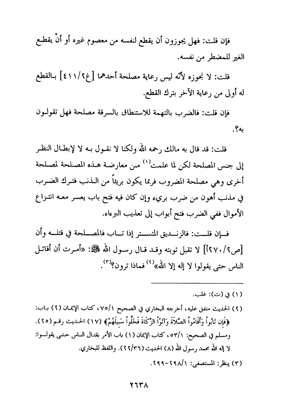 فإن قلت: فالضرب بالتهمة للاستنطاق بالسرقة مصلحة فهل تقولون به؟ .