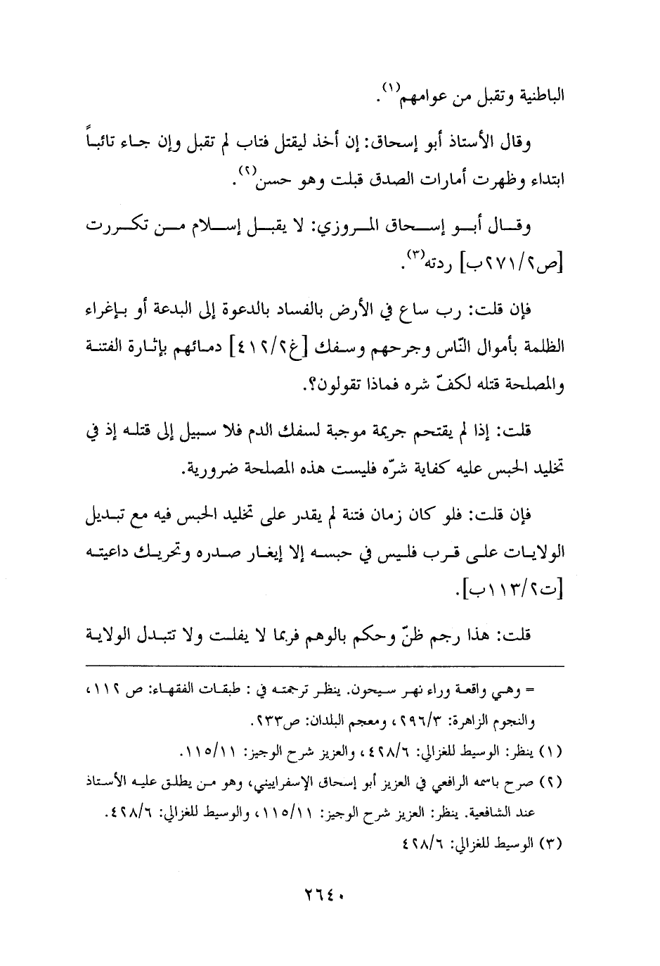 (¬٢) صرح باسمه الرافعي في العزيز أبو إسحاق الإسفراييني، وهو من يطلق عليه الأستاذ عند الشافعية. ينظر: العزيز شرح الوجيز: ١١/ ١١٥، والوسيط للغزالي: ٦/ ٤٢٨.