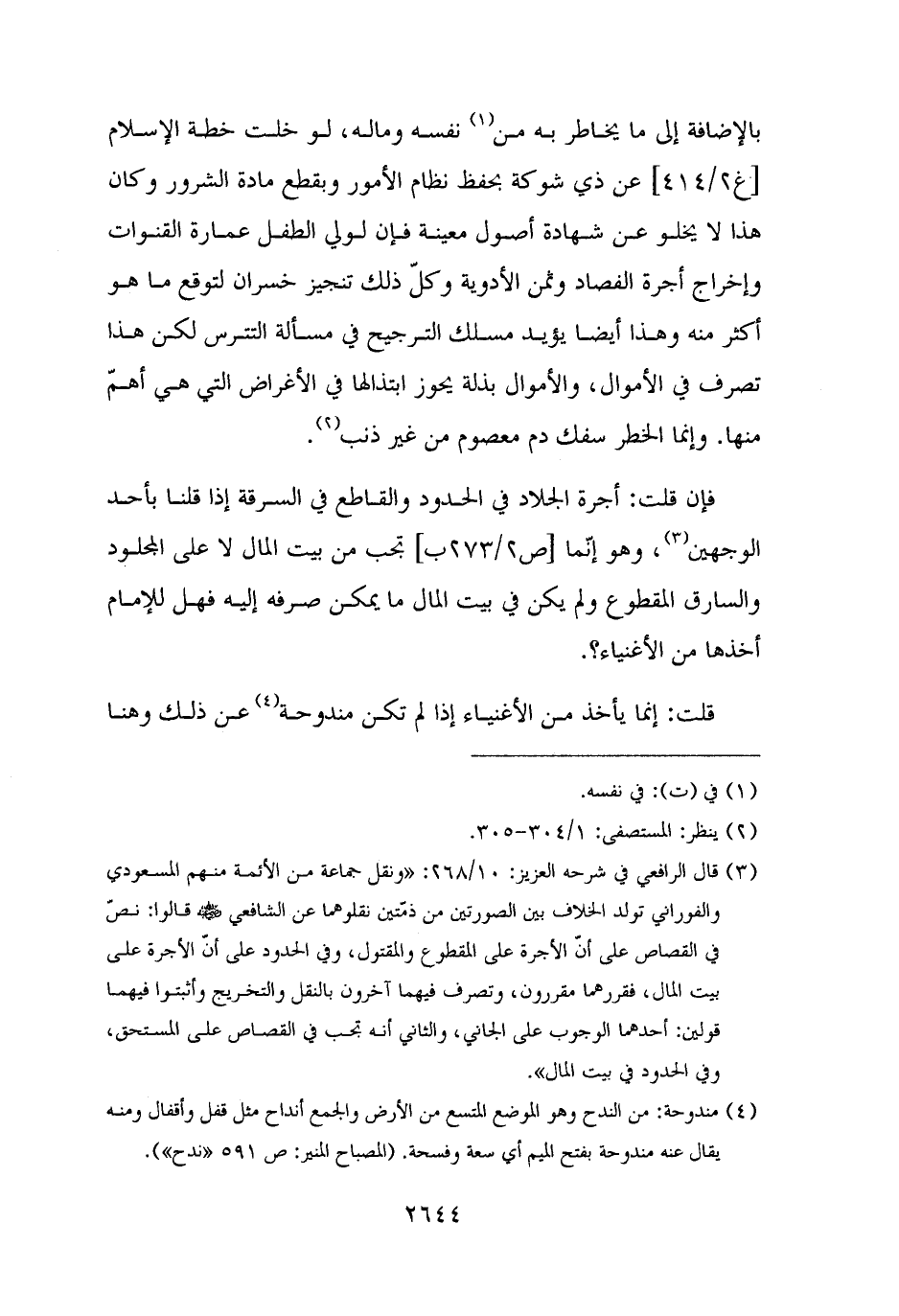 (¬٣) قال الرافعي في شرحه العزيز: ١٠/ ٢٦٨: "ونقل جماعة من الأئمة منهم المسعودي والفوراني تولد الخلاف بين الصورتين من ذمَّتين نقلوهما عن الشافعي - رضي الله عنه - قالوا: نصّ في القصاص على أنّ الأجرة على المقطوع والمقتول، وفي الحدود على أنّ الأجرة على بيت المال، فقررهما مقررون، وتصرف فيهما آخرون بالنقل والتخريج وأثبتوا فيهما قولين: أحدهما الوجوب على الجاني، والثاني أنه تجب في القصاص على المستحق، وفي الحدود فى بيت المال".