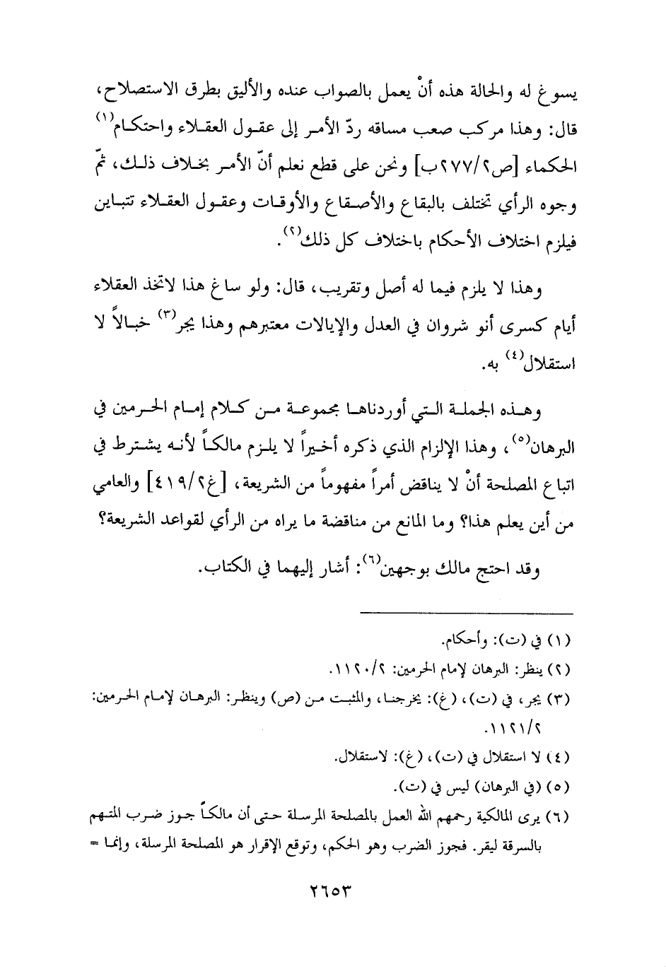 يسوغ له والحالة هذه أنْ يعمل بالصواب عنده والأليق بطرق الاستصلاح، قال: وهذا مركب صعب مساقه ردّ الأمر إلى عقول العقلاء واحتكام (¬١) الحكماء ونحن على قطع نعلم أنّ الأمر بخلاف ذلك، ثمّ وجوه الرأي تختلف بالبقاع والأصقاع والأوقات وعقول العقلاء تتباين فيلزم اختلاف الأحكام باختلاف كل ذلك (¬٢).