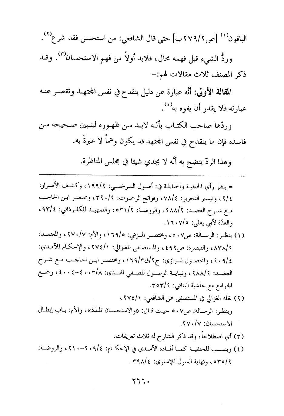 وردُّ الشيء قبل فهمه محال، فلا بد أولًا من فهم الاستحسان (¬٣). وقد ذكر المصنف ثلاث مقالات لهم: -