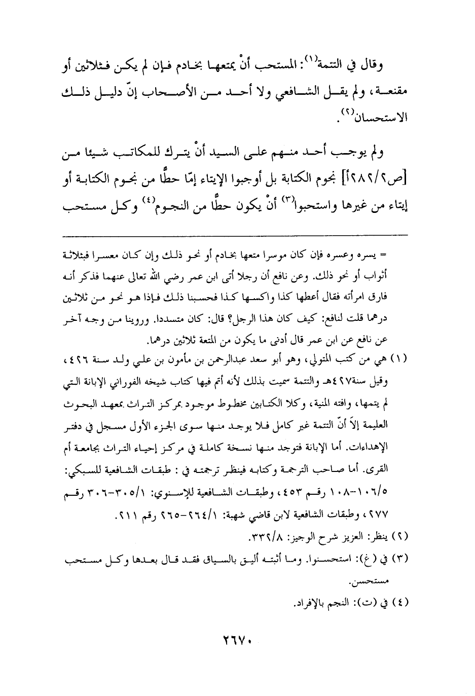 (¬١) هي من كتب المتولي، وهو أبو سعد عبد الرحمن بن مأمون بن علي ولد سنة ٤٢٦، وقيل سنة ٤٢٧ هـ والتتمة سميت بذلك لأنه أتم فيها كتاب شيخه الفوراني الإبانة التي لم يتمها، وافته المنية، وكلا الكتابين مخطوط موجود بمركز التراث بمعهد البحوث العلمية إلا أنّ التتمة غير كامل فلا يوجد منها سوى الجزء الأول مسجل في دفتر الإهداءات. أما الإبانة فتوجد منها نسخة كاملة في مركز إحياء التراث بجامعة أم القرى. أما صاحب الترجمة وكتابه فينظر ترجمته في: طبقات الشافعية للسبكي: ٥/ ١٠٦ - ١٠٨ رقم ٤٥٣، وطبقات الشافعية للإسنوي: ١/ ٣٠٥ - ٣٠٦ رقم ٢٧٧، وطبقات الشافعية لابن قاضي شهبة: ١/ ٢٦٤ - ٢٦٥ رقم ٢١١.