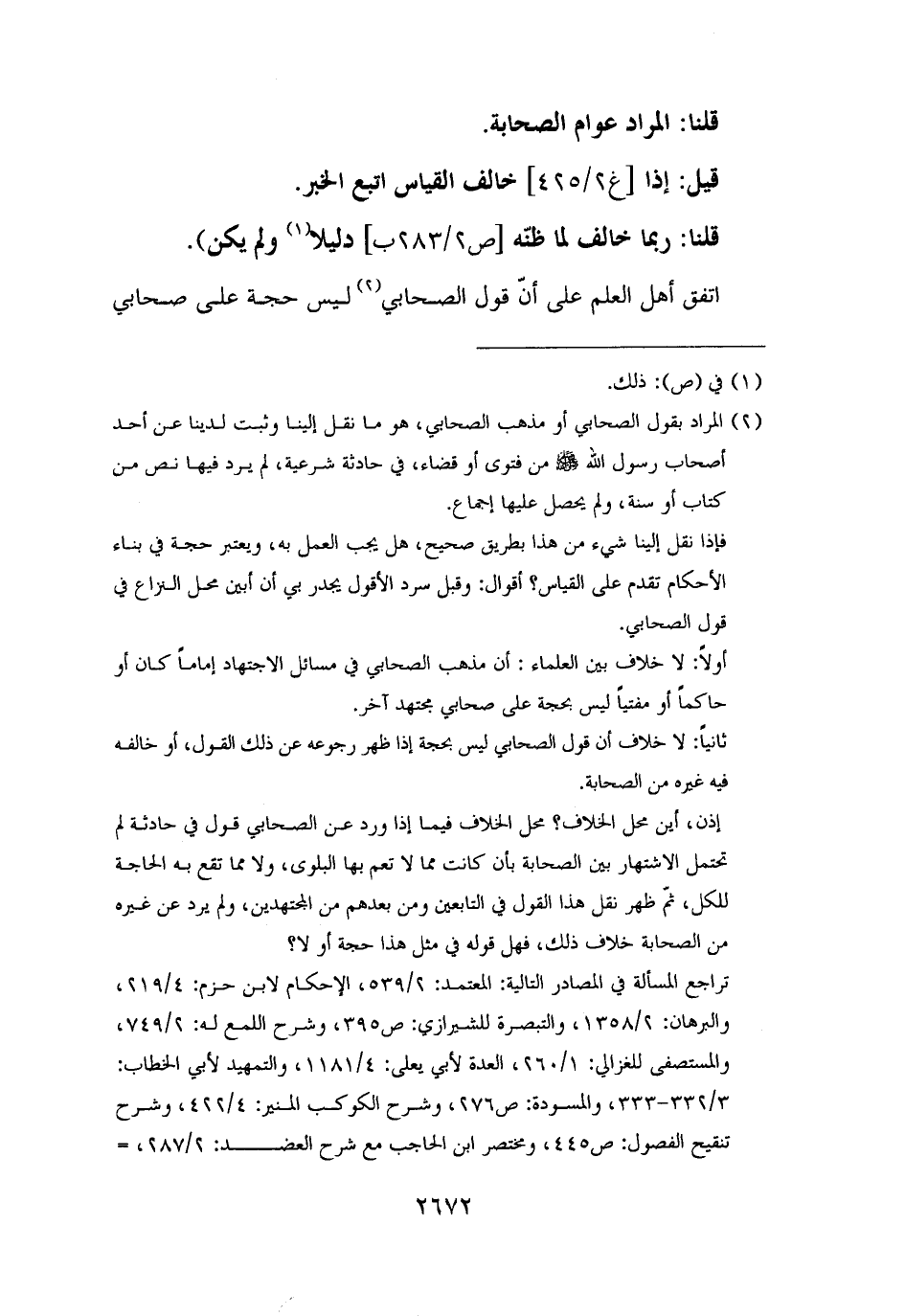(¬٢) المراد بقول الصحابي أو مذهب الصحابي، هو ما نقل إلينا وثبت لدينا عن أحد أصحاب رسول الله - صلى الله عليه وسلم - من فتوى أو قضاء، في حادثة شرعية، لم يرد فيها نص من كتاب أو سنة، ولم يحصل عليها إجماع.