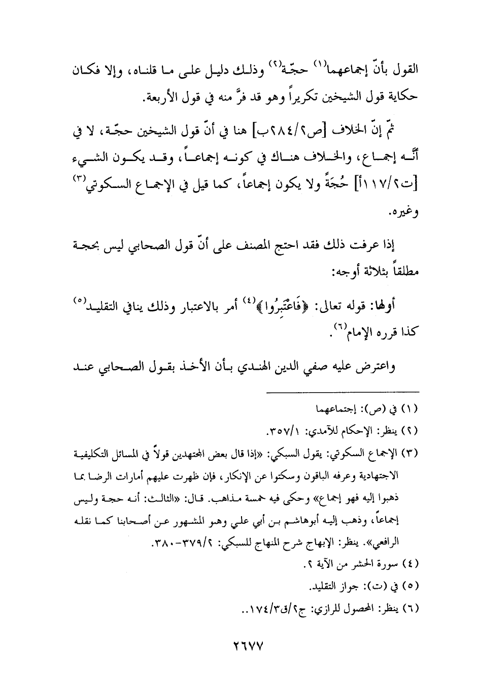 ثمّ إنّ الخلاف هنا في أنّ قول الشيخين حجّة، لا في أنَّه إجماع، والخلاف هناك في كونه إجماعًا، وقد يكون الشيء حُجَةً ولا يكون إجماعًا، كما قيل في الإجماع السكوتي (¬٣) وغيره.