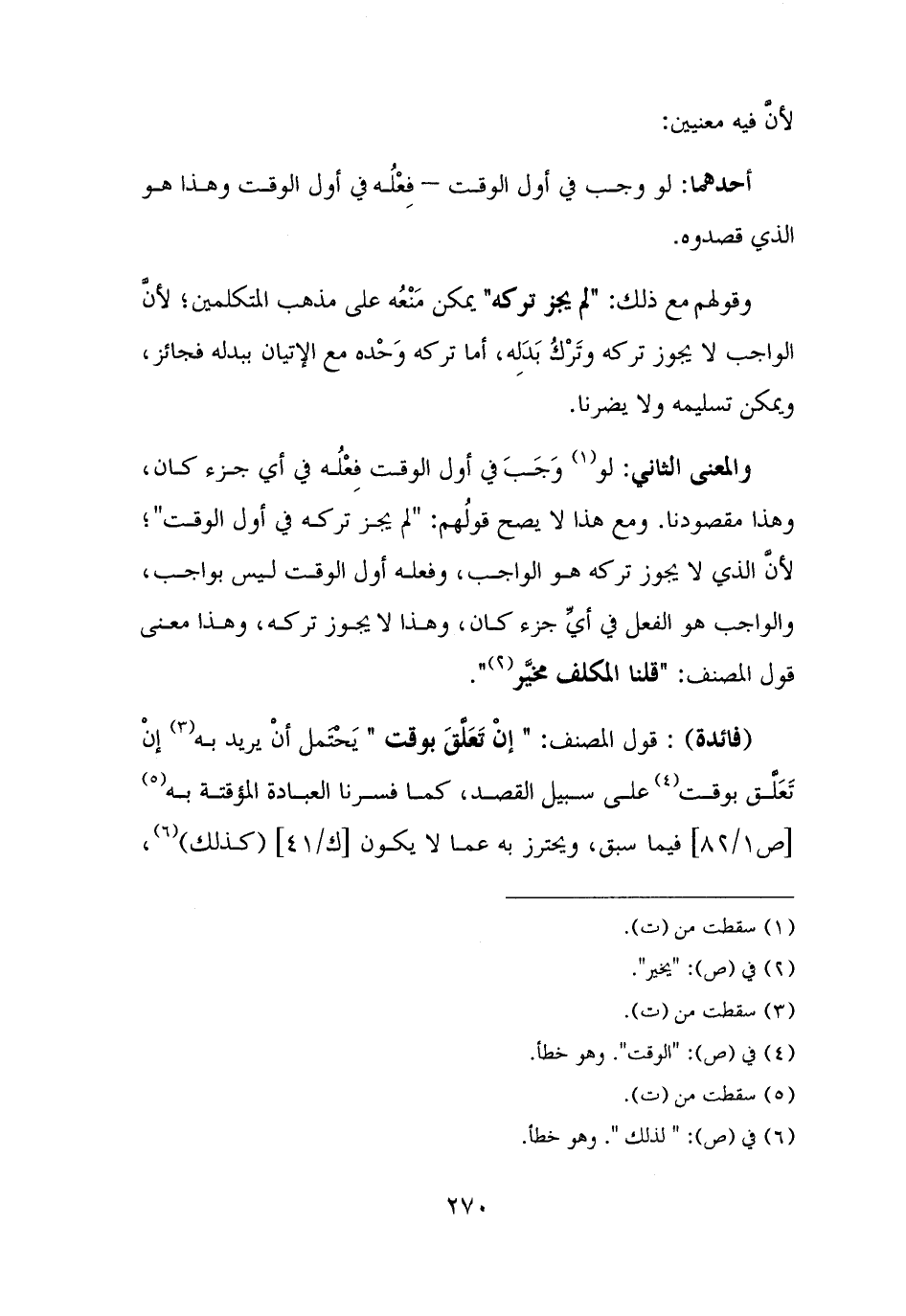 والمعنى الثاني: لو (¬١) وَجَبَ في أول الوقت فِعْلُه في أي جزء كان، وهذا مقصودنا. ومع هذا لا يصح قولُهم: "لم يجز تركه في أول الوقت"؛ لأنَّ الذي لا يجوز تركه هو الواجب، وفعله أول الوقت ليس بواجب، والواجب هو الفعل في أيِّ جزء كان، وهذا لا يجوز تركه، وهذا معنى قول المصنف: "قلنا المكلف مخيَّر (¬٢) ".