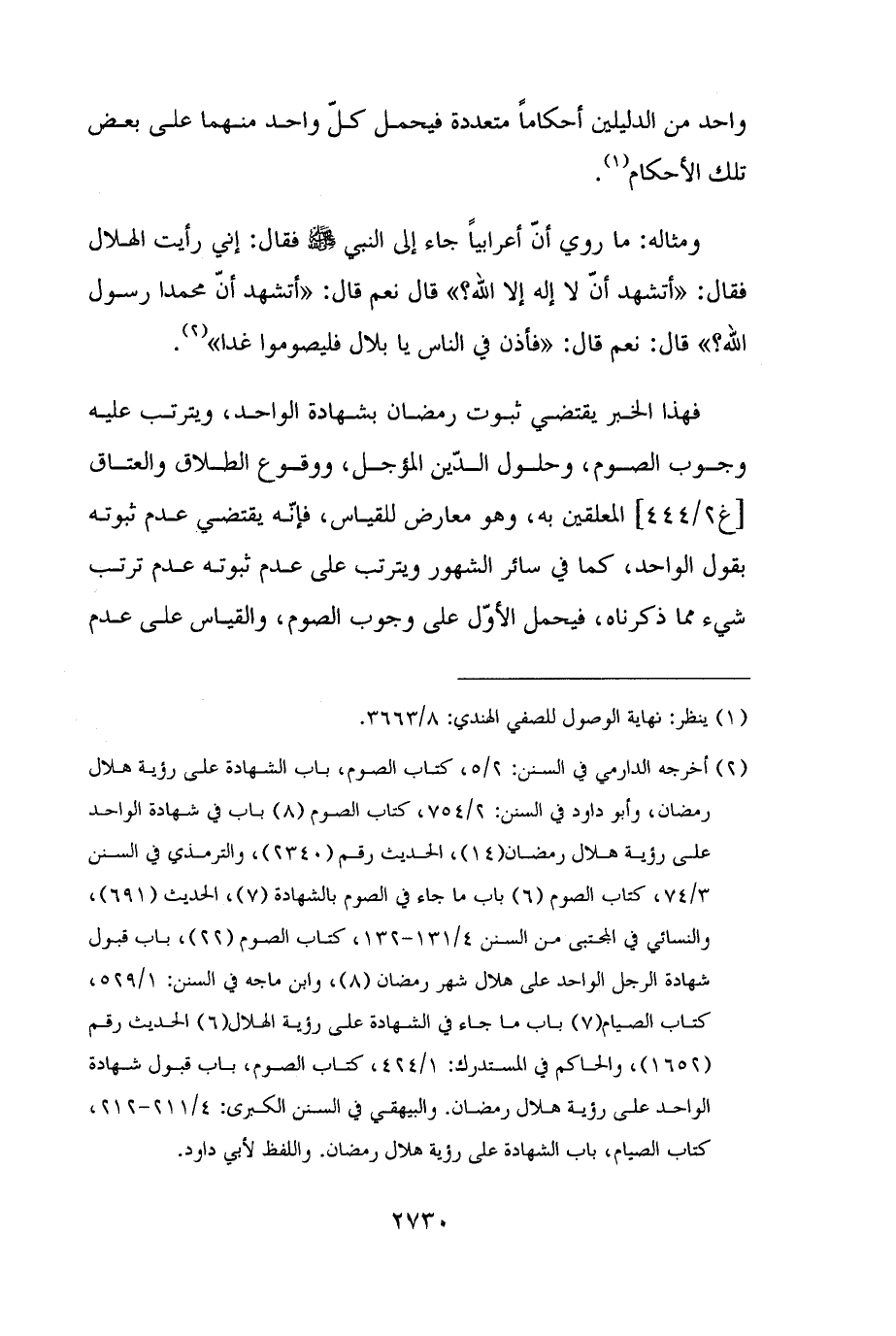 (¬٢) أخرجه الدارمي في السنن: ٢/ ٥، كتاب الصوم، باب الشهادة على رؤية هلال رمضان، وأبو داود في السنن: ٢/ ٧٥٤، كتاب الصوم (٨) باب في شهادة الواحد على رؤية هلال رمضان (١٤)، الحديث رقم (٢٣٤٠)، والترمذي في السنن ٣/ ٧٤، كتاب الصوم (٦) باب ما جاء في الصوم بالشهادة (٧)، الحديث (٦٩١)، والنسائي في المجتبى من السنن ٤/ ١٣١ - ١٣٢، كتاب الصوم (٢٢)، باب قبول شهادة الرجل الواحد على هلال شهر رمضان (٨)، وابن ماجه في السنن: ١/ ٥٢٩، كتاب الصيام (٧) باب ما جاء في الشهادة على رؤية الهلال (٦) الحديث رقم (١٦٥٢)، والحاكم في المستدرك: ١/ ٤٢٤، كتاب الصوم، باب قبول شهادة الواحد على رؤية هلال رمضان. والبيهقي في السنن الكبرى: ٤/ ٢١١ - ٢١٢، كتاب الصيام، باب الشهادة على رؤية هلال رمضان. واللفظ لأبي داود.