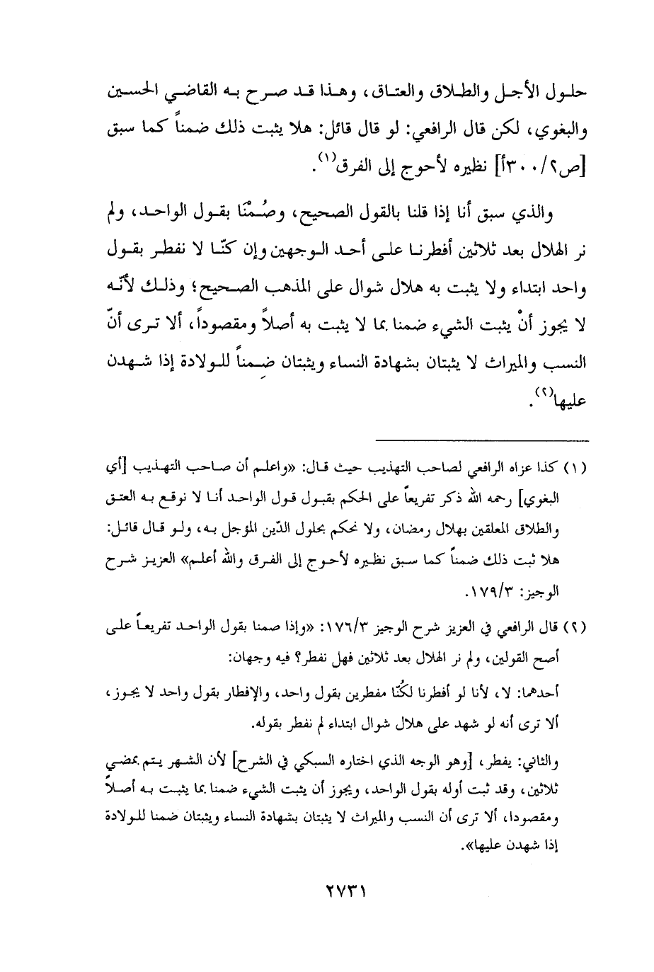 (¬١) كذا عزاه الرافعي لصاحب التهذيب حيث قال: "واعلم أن صاحب التهذيب [أي البغوي] رحمه الله ذكر تفريعًا على الحكم بقبول قول الواحد أنا لا نوقع به العتق والطلاق المعلقين بهلال رمضان، ولا نحكم بحلول الدّين المؤجل به، ولو قال قائل: هلا ثبت ذلك ضمنًا كما سبق نظيره لأحوج إلى الفرق والله أعلم" العزيز شرح الوجيز: ٣/ ١٧٩.