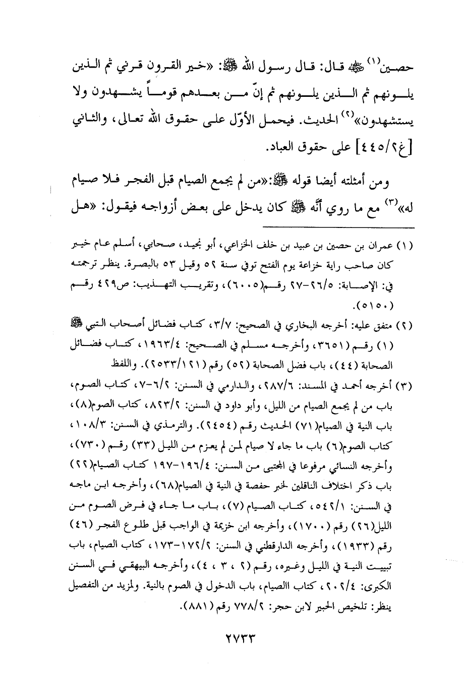 حصين (¬١) - رضي الله عنه - قال: قال رسول الله - صلى الله عليه وسلم -: "خير القرون قرني ثم الذين يلونهم ثم الذين يلونهم ثم إنّ من بعدهم قومًا يشهدون ولا يستشهدون" (¬٢) الحديث. فيحمل الأوّل على حقوق الله تعالى، والثاني على حقوق العباد.