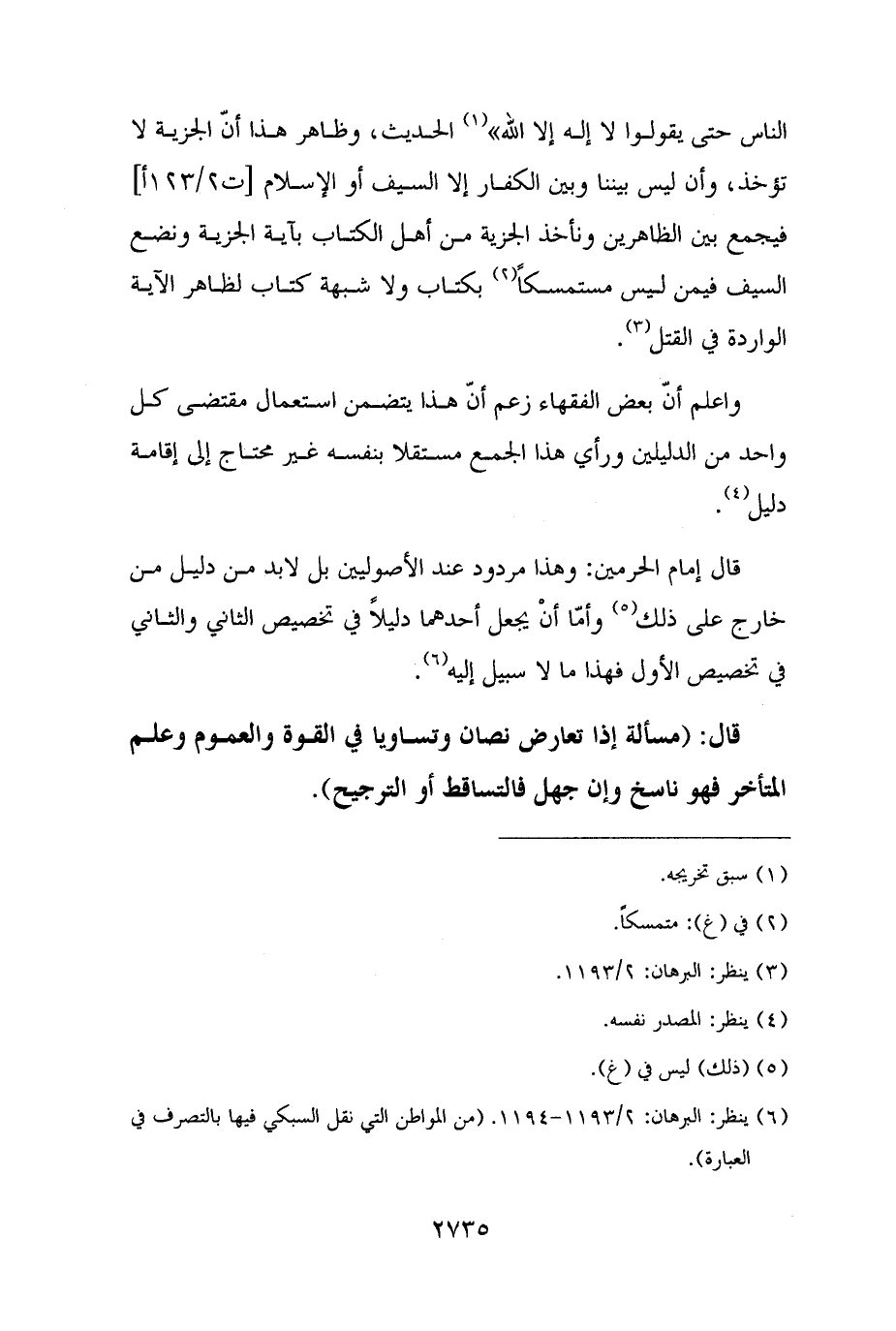 (¬٦) ينظر: البرهان: ٢/ ١١٩٣ - ١١٩٤. (من المواطن التي نقل السبكي فيها بالتصرف في العبارة).