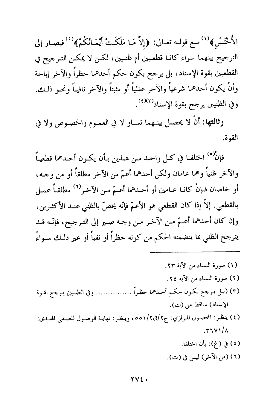 الْأُخْتَيْنِ} (¬١) مع قوله تعالى: {إِلَّا مَا مَلَكَتْ أَيْمَانُكُمْ} (¬٢) فيصار إلى الترجيح بينهما سواء كانا قطعيين أم ظنيين، لكن لا يمكن الترجيح في القطعيين بقوة الإسناد، بل يرجح يكون حكم أحدهما حظرًا والآخر إباحة وأنْ يكون أحدهما شرعيًا والآخر عقليًا أو مثبتًا والآخر نافيًا ونحو ذلك. وفي الظنيين يرجح بقوة الإسناد (¬٣) (¬٤).